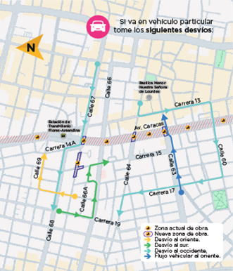 La construcción del viaducto de la Línea 1 del Metro de Bogotá avanza en la av. Caracas entre las calles 63 y 67. En esta zona se presentarán cierres parciales o totales.En todo momento, se garantizará la circulación de vehículos particulares, así como los pasos peatonales y de biciusuarios. TransMilenio seguirá operando con normalidad en su horario habitual. Bogotá, D. C. Septiembre 19, 2025 Bogotá, 19 de septiembre de 2025. Aquí sí Pasa, y en Bogotá Mi Ciudad, Mi Casa avanzamos por una movilidad sostenible para todos los ciudadanos. Por eso, a partir del 21 de septiembre, iniciaremos con el traslado de redes en la av. Caracas entre las calles 63 y 67.Para llevar a cabo estos trabajos, se implementarán los siguientes cierres y modificaciones viales: 1. Cierre total de la Calle 67 entre la carrera 14A Bis y unos metros al occidente de la carrera 15, así como la carrera 15 entre la calle 67 y unos metros al sur.2. Cierre de la intersección de la av. Caracas con calle 64; solo permanecerá habilitado el paso peatonal y el tránsito de biciusuarios. 3. Cierre parcial en la intersección de la av. Carcas con calle 67; se mantendrá el flujo vehicular en sentido oriente-occidente, así como el paso peatonal y de biciusuarios. 4. Cierre parcial de la intersección de la av. Caracas con calle 63; se mantendrá el flujo vehicular sentido occidente-oriente, paso peatonal y de biciusuarios. 5. Cierre parcial de la calzada oriental de TransMilenio, garantizando la operación normal del sistema de transporte. Durante las obras, la Secretaria Distrital de Movilidad (SDM) ha autorizado los siguientes desvíos para el tráfico vehicular:Desvío al oriente: Los vehículos que se dirijan al oriente deberán tomar la carrera 17 hacia el norte y luego continuar por la calle 69 hacia el oriente para continuar su recorrido habitual. Además, el flujo vehicular al oriente también será por la calle 63.Desvío al sur: Quienes se desplacen en dirección sur por la calle 68 deben tomar la carrera 19 hacia el sur, continuar por la calle 66 hasta la calle 66A y girar hacia el sur por la carrera 15. Desvío al Occidente: Los vehículos que transiten por la calle 67 y necesiten dirigirse al occidente, deben tomar la carrera 14A hasta la calle 68, para continuar su recorrido. En cambio, quienes se desplacen por la calle 64 al occidente deberán tomar la calle 13 al sur, seguir por la calle 60 al occidente hasta la carrera 17, hasta retomar su recorrido al occidente por la calle 64.Desde la Empresa Metro de Bogotá adoptamos mecanismos de mejora continua que nos permiten crear espacios seguros para los ciudadanos y trabajadores en todos los frentes de obra y entornos de la Línea 1 del Metro de Bogotá. A través del Sistema de Gestión de Seguridad y Salud en el Trabajo (SGSST), seguimos rigurosos estándares que nos garantizan que los ciudadanos cuenten con ambientes seguros, y que cada trabajador regrese a su hogar al final del día sin incidentes. Agradecemos a la ciudadanía atender la señalización en vía y utilizar las rutas alternas habilitadas durante la obra. Para más información sobre estas intervenciones, pueden acercarse a la Oficina de Atención al Ciudadano, ubicada en la calle 72 #10-34, centro comercial Avenida Chile, local 147. Documentos adjuntos bp-traslado-redes-63-67.pdf Tags Atención Avances Línea 1 Obras PMT Noticias Relacionadas A partir del 5 de octubre, nuevos cierres y desvíos en la Avenida Caracas Septiembre 23, 2024 Atención Avances Línea 1 Obras PMT Continúan trabajos de la Línea 1 del Metro de Bogotá en la avenida Primero de mayo entre la avenida Villavicencio y la calle 42 sur Septiembre 22, 2024 Atención Avances Línea 1 Obras PMT Avanza el traslado de redes y el hincado de pilotes del viaducto de la Línea 1 del Metro de Bogotá en la av. Villavicencio entre Agoberto Mejía y Primero de Mayo Septiembre 27, 2024 Atención Avances Concesionario Línea 1 Obras PMT Por nuevo frente de pilotaje para la construcción del Metro, se restringe circulación vehicular en la avenida Primero de Mayo Octubre 10, 2024 Atención Avances Línea 1 Obras PMT Cargar más Volver a Sala de Prensa Volver a inicio